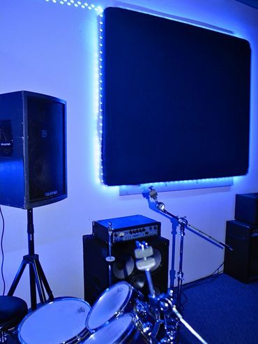 Fitted with blue acoustic panels lined with ambient LED lights, you are sure to feel relaxed and ready to create!